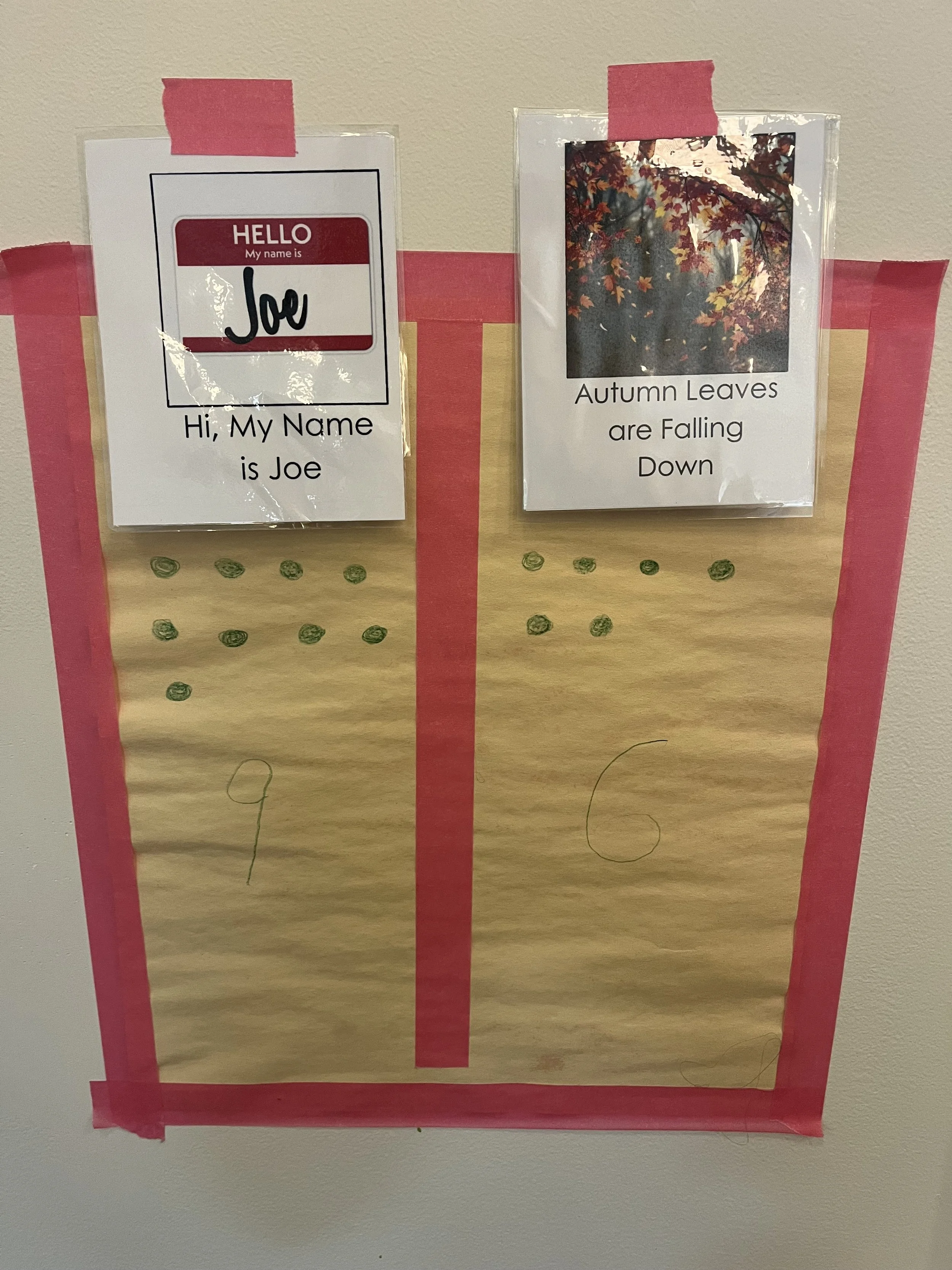 After the discussion, the class helped vote for what song they wanted to sing, Autumn Leaves or Hi, My Name is Joe. Kids told Colette which song they wanted to sing and she would mark it on a piece of paper. After everyone voted, we all helped count which song had more votes. With a count of 9 to 6, Hi, My Name is Joe was the clear winner.